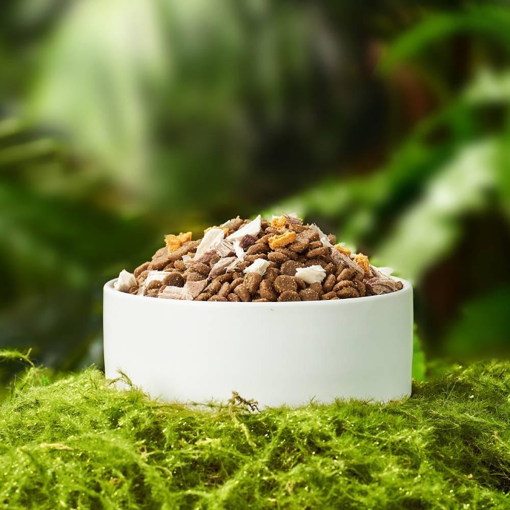 This food offers the benefits of raw feeding without the hassle of daily preparation. It preserves the essential nutrients and flavors of raw ingredients while being shelf-stable and easy to store, making it convenient and nutritious.