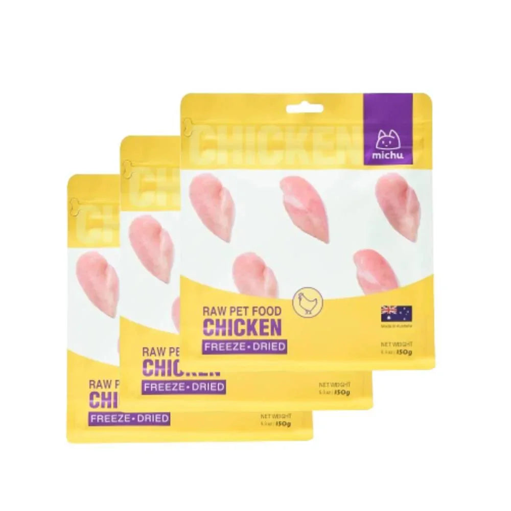Michu Freeze-Dried Pet Food is made with premium, farm-fresh chicken, beef, and salmon from Tasmania, Australia, without antibiotics, steroids, or added hormones.